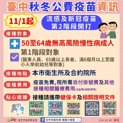 一、依旨揭疫苗接種規劃,自本年101日起COVID-19疫苗與流感疫苗同步分2階段開打,實施期程及開放接種對象如下: