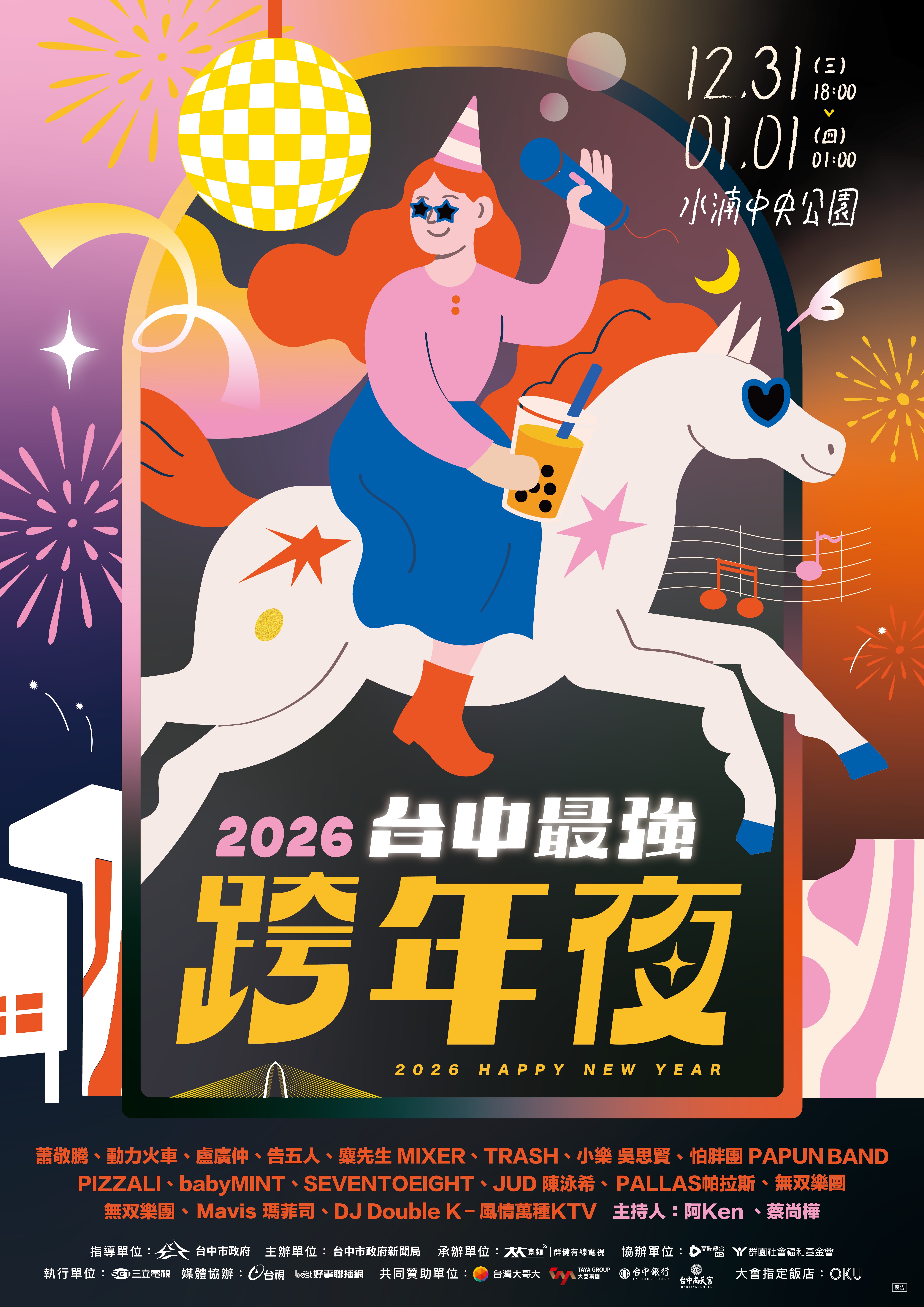 「臺中最強跨年夜」,今年再次在水湳中央公園熱鬧登場!繼金曲歌王蕭敬騰、文青天團告五人、經典天團動力火車後,「三金滿貫歌王」盧廣仲與青春能量爆棚的怕胖團加入陣容,將陪伴市民一路嗨到凌晨1點。主持陣容則由阿KEN十度回歸,再度用「Ken式幽默」帶動全場氣氛。