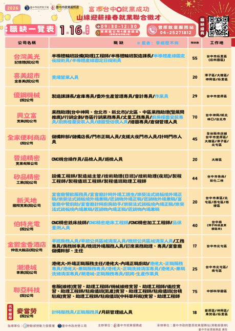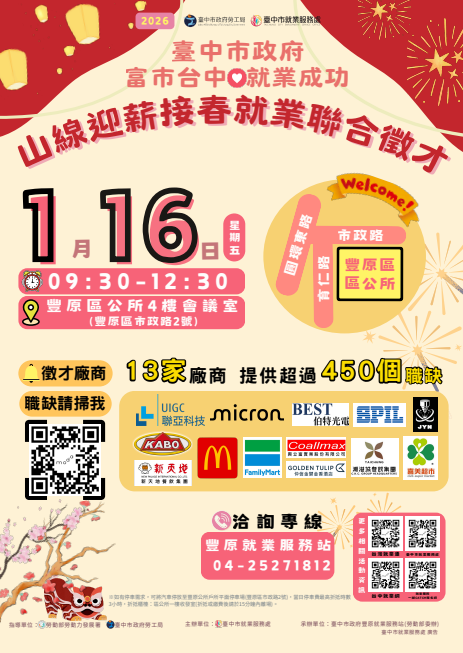 好職、好機會,山線新年一次全網羅!臺中市就業服務處將於115年1月16日(星期五)上午9時30分至12時30分,在豐原區公所4樓會議室辦理聯合徵才,邀請台灣美光、聯亞科技、全家便利商店及新天地等共13家,提供超過450個職缺,歡迎把握機會踴躍參加,活動詳情請至臺中市就業服務處官網查詢。