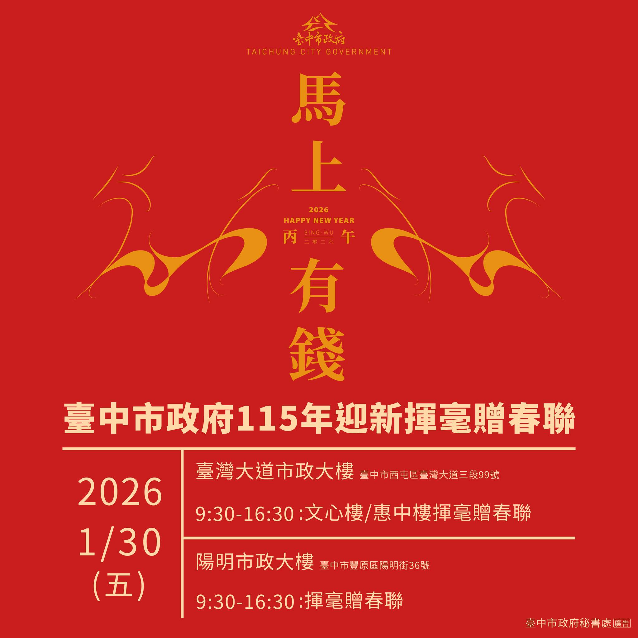 一、為迎接馬年到來及增添年節文化氣息,臺中市政府秘書處訂於115年1月30日辦理「115年迎新揮毫贈春聯活動」,邀請本市152位書法家為市民提供免費寫春聯服務,並有限量好禮送,歡迎一同來體會年節氣氛。