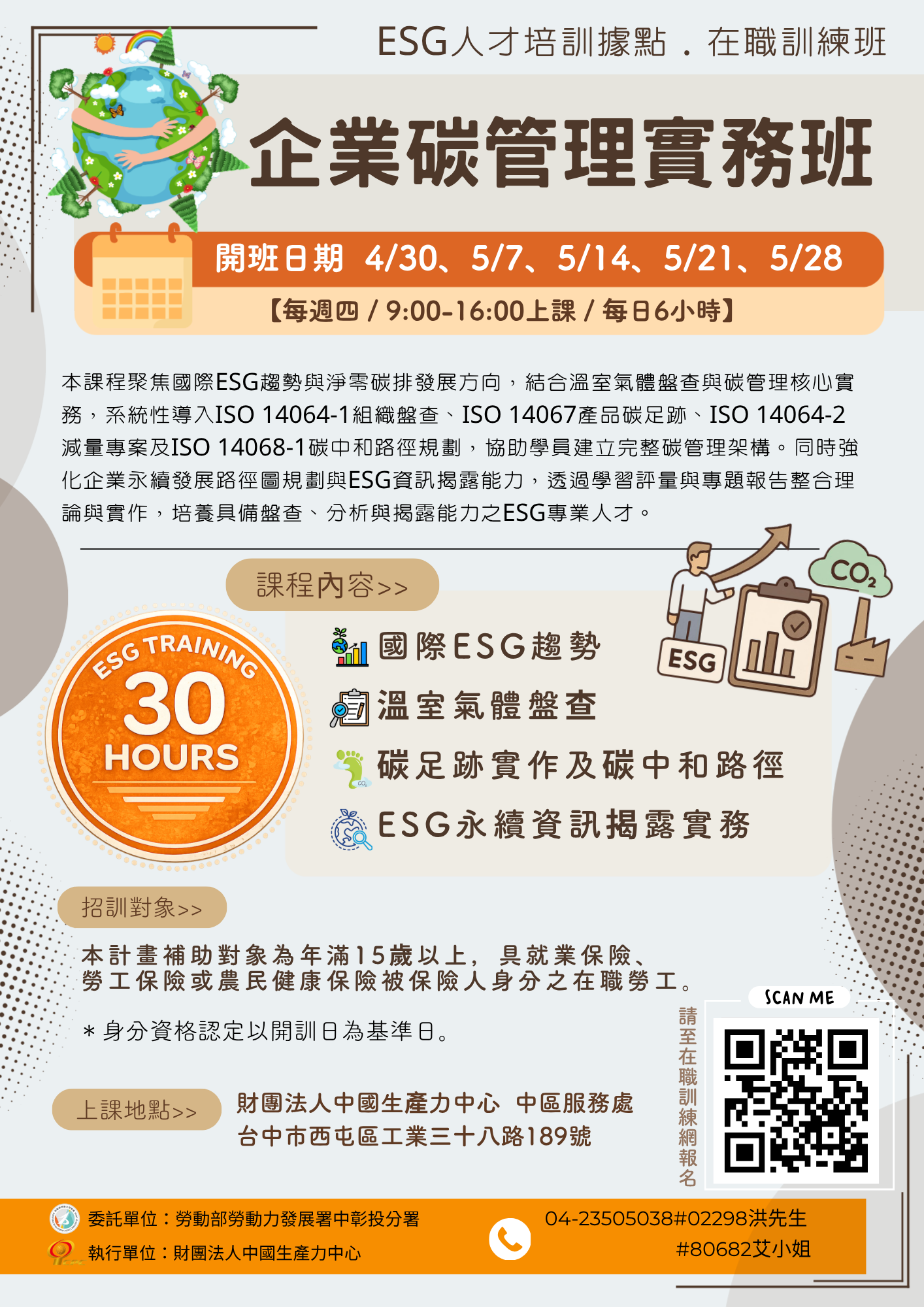 (四) 訓練期間:115年4月30日至115年5月28日(每週四,早上9:00至下午4:00),共計30小時。